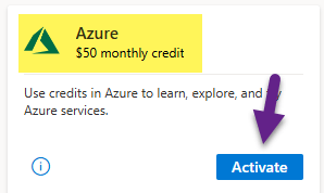 3. Fine Azure $50 monthly credit benefit listed and click on Activate