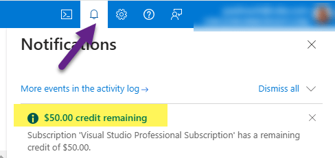 5. You will have your $50 credit balance shown in your Azure portal notifications.
