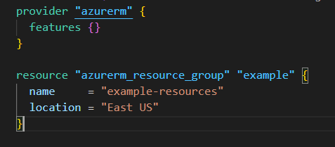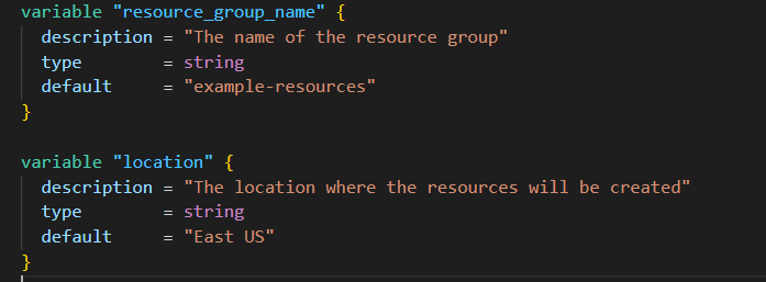 In this variables.tf file, variables for the resource group name and location are declared, which can then be referenced in main.tf.